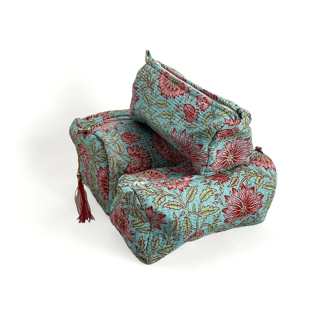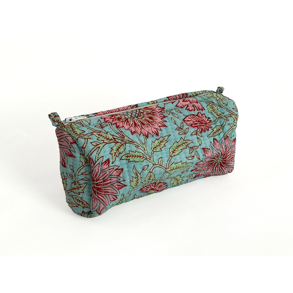 Blue and Pink Floral Block Print Cotton Washbag, Make Up Bag, Pencil Case with Waterproof Lining - Pink Sunflower Print