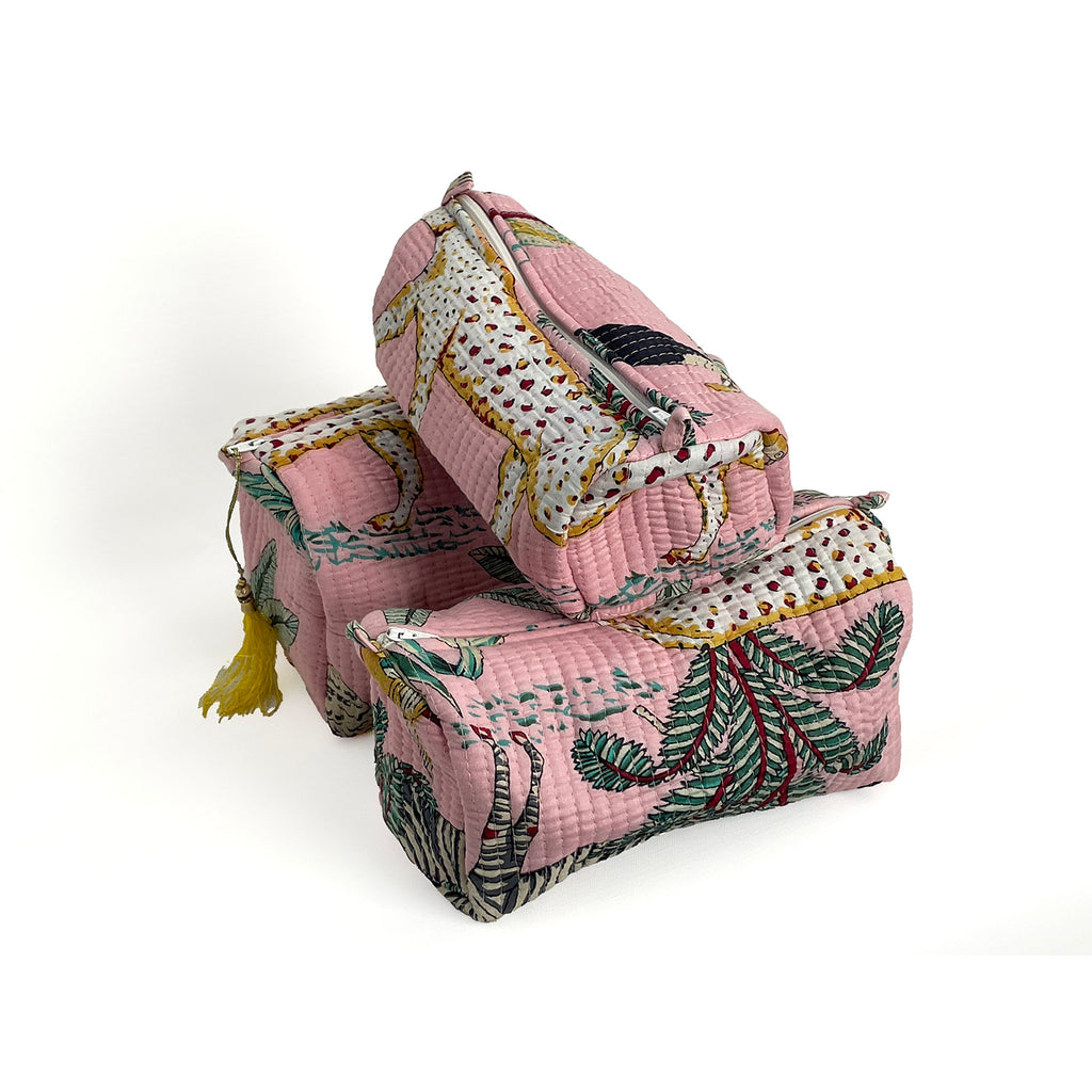 This charming jungle print quilted washbag features a fully waterproof lining and internal pockets, crafted from soft quilted cotton by skilled artisans in Jaipur, India.