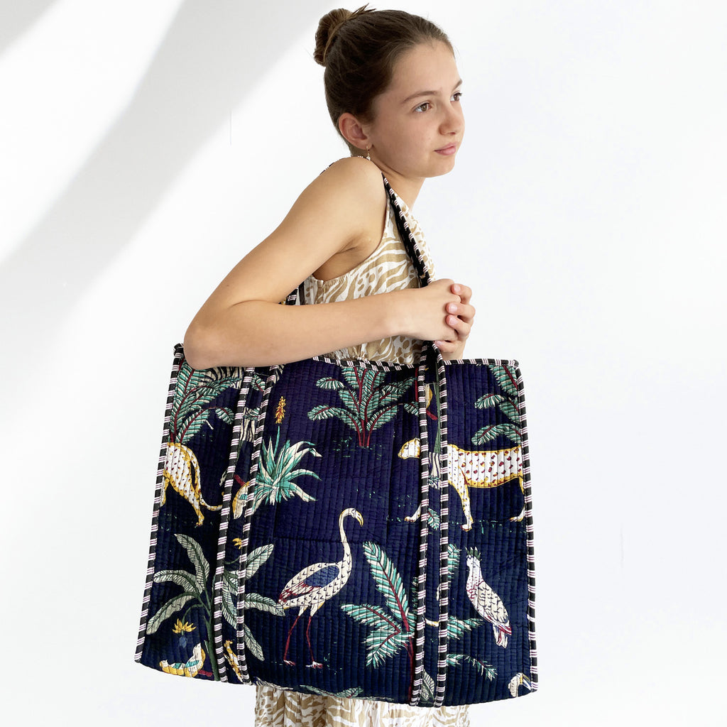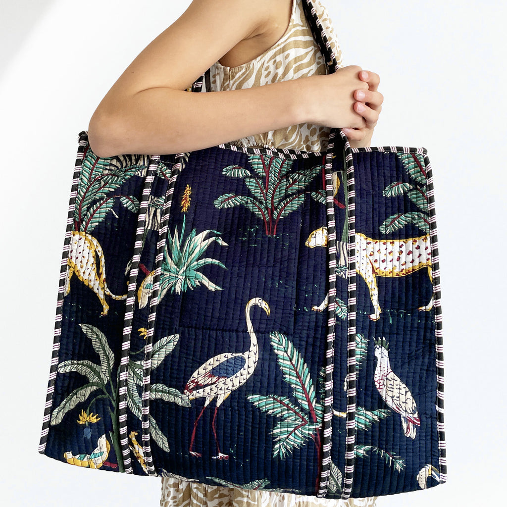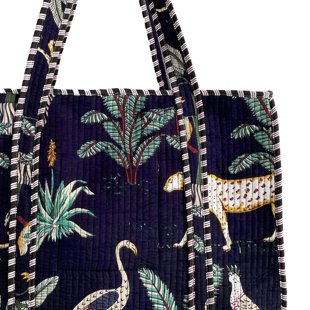 Jungle Print Large Quilted Cotton Tote Shoulder Bag in Navy Blue