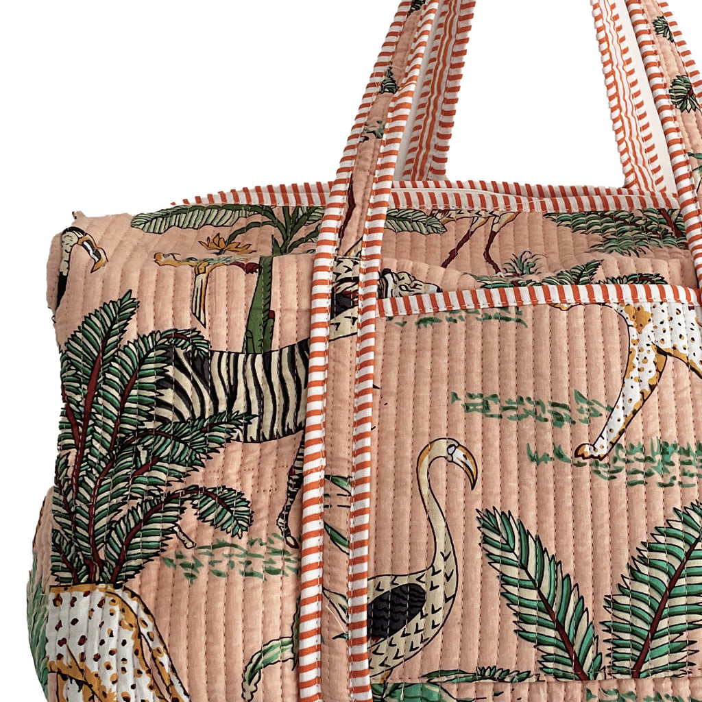 Each bag is one-of-a-kind due to its handmade nature, with slight variations in print placement. Each bag is individually made by artisans in Jaipur, India, using 100% Cotton and natural fibres for the quilting.