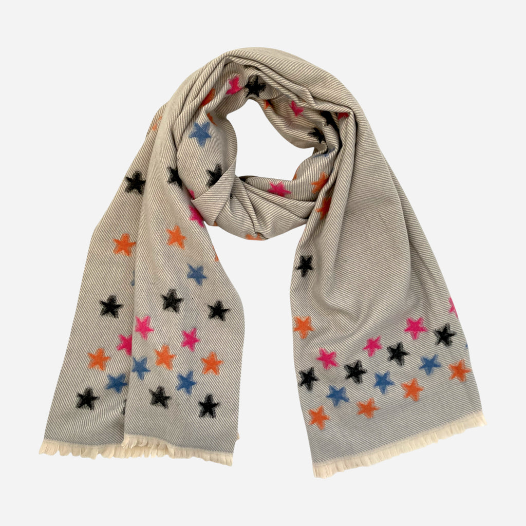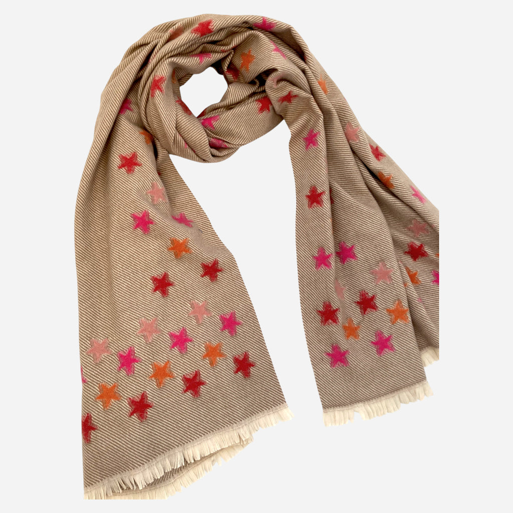Drape yourself in luxury with this super-soft herringbone scarf with a colourful star pattern, available in browns or light grey.