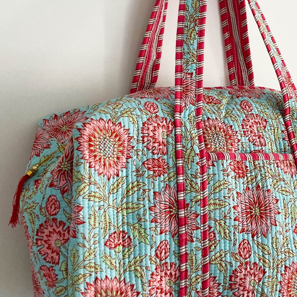 Each bag is one-of-a-kind due to its handmade nature, with slight variations in print placement. Each bag is individually made by artisans in Jaipur, India, using 100% Cotton and natural fibres for the quilting.
