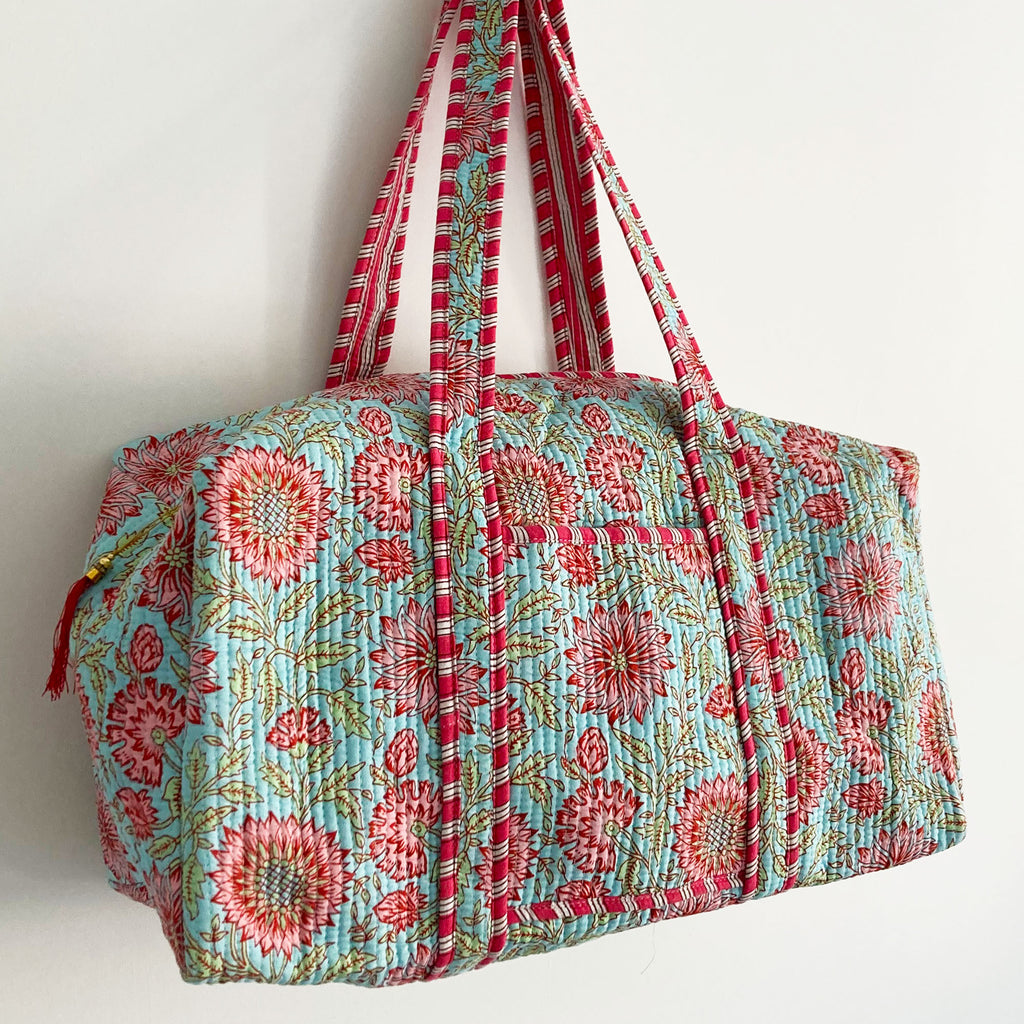 Blue and Pink Floral Cotton Quilted Weekend Duffle Bag