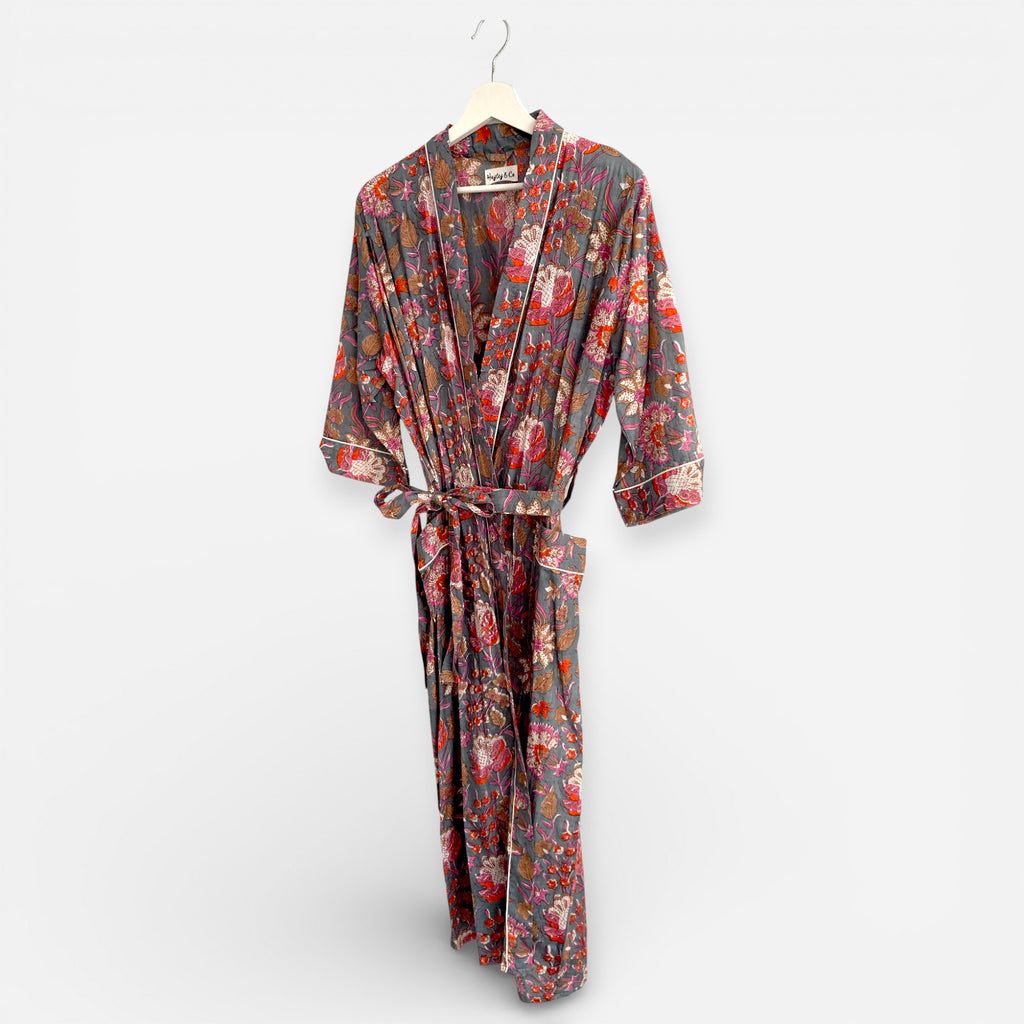 This lightweight pink and grey floral block print cotton kimono style dressing gown is ideal for warm summer days when you want something breezy and comfortable.